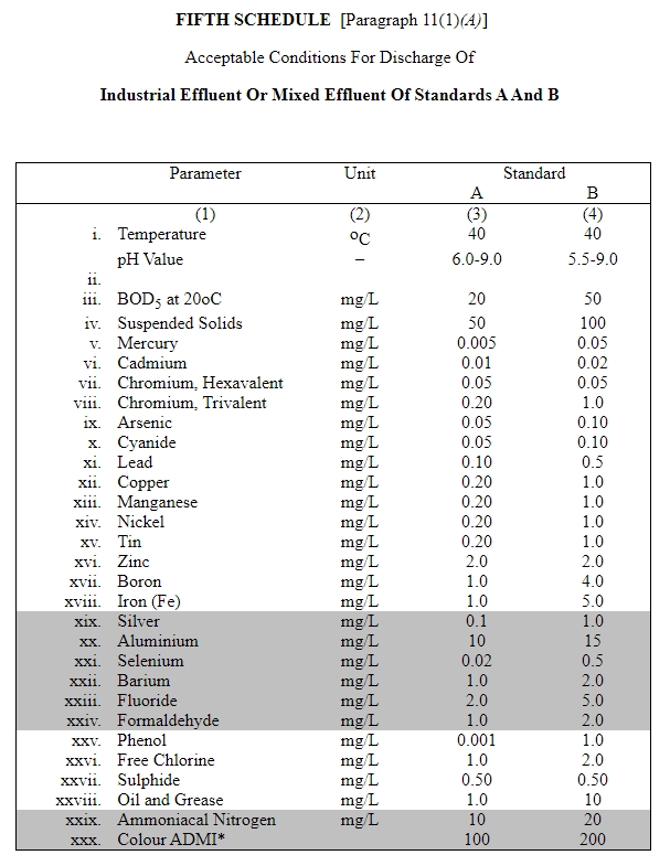 Amendment on ENVIRONMENTAL QUALITY ACT 1974 was gazette on 12 October 2009 by the Minister of Natural Resources and the Environment, Datuk Douglas Uggah Embas. The new regulations may be cited as the Environmental Quality (Industrial Effluent) Regulations 2009. With this, the recent Environmental Quality (Industrial Effluent) Regulations, 1979 is annulled. Attached herewith the Fifth Schedule and Seventh Schedule of the Regulation.