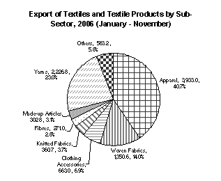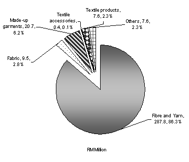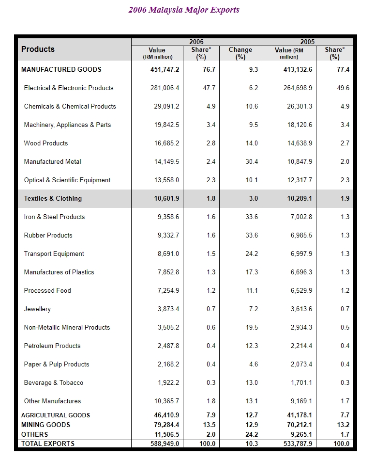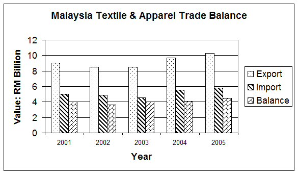 Total exports of textiles and apparel in 2009 were valued at RM8.9 billion, compare with RM10.5 in the previous year. A total of RM5.1 billion or 56.8% of Malaysia’s exports in 2009 were textiles. The top three export items of textiles and apparel were textiles yarns (RM2.5 billion), woven and other textiles apparel (RM1.3 billion) and men’s apparel, not knitted/crocheted (RM643.5 million).