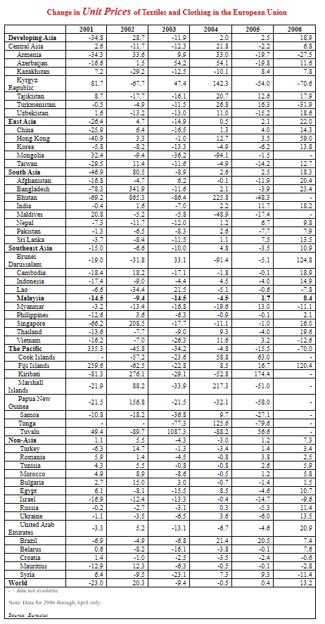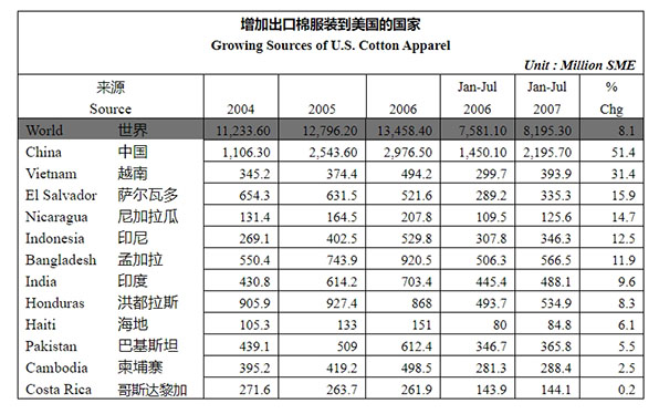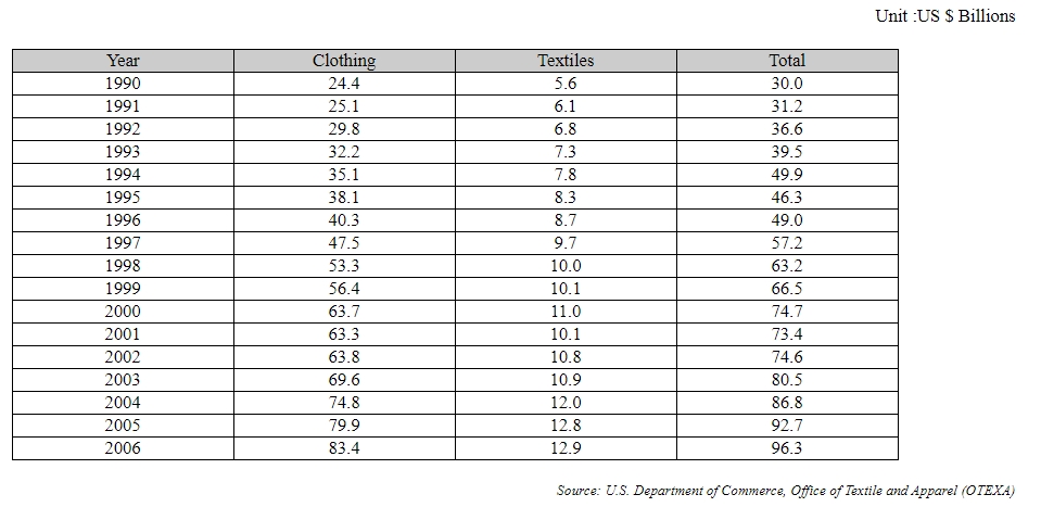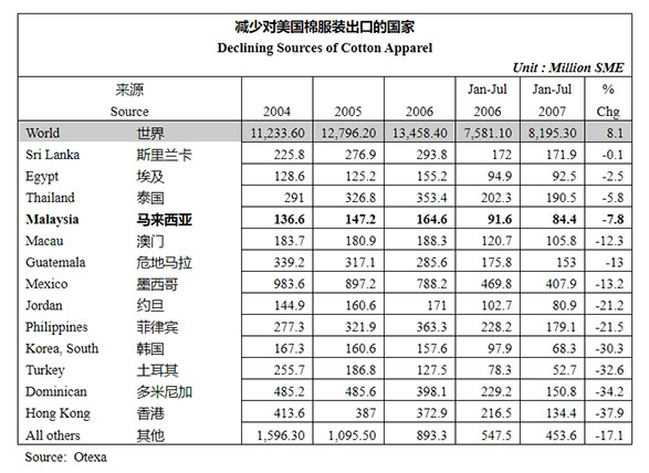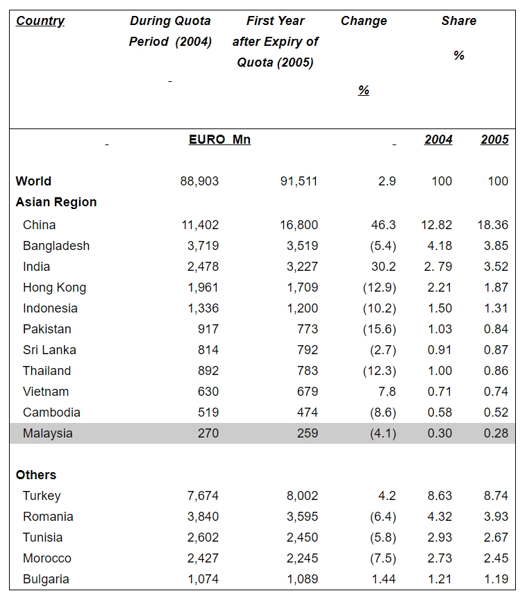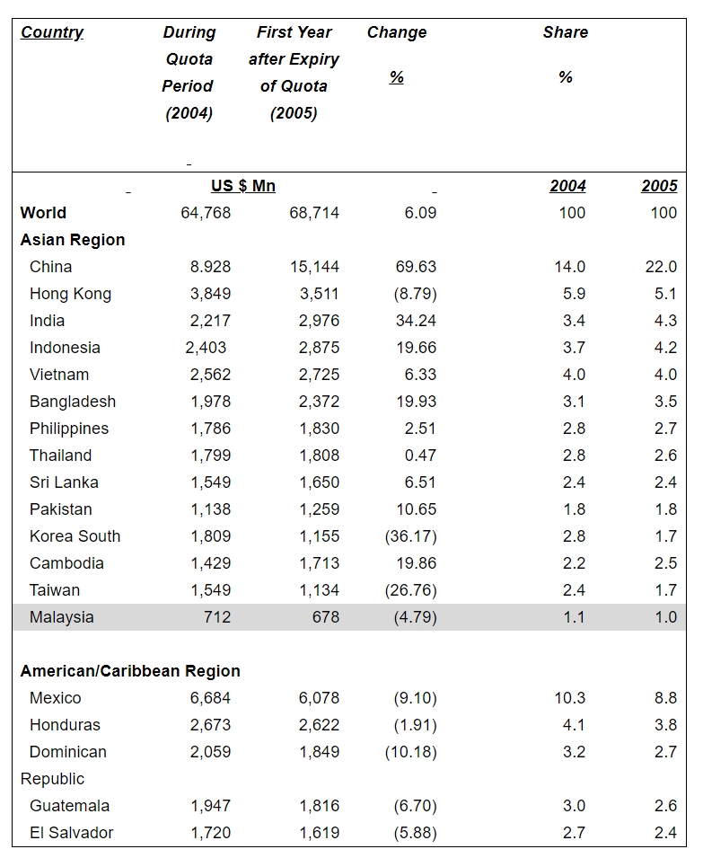 Quotas imposed on exports of textiles and apparel products from China to the USA was lifted in the beginning of 2009 as one of the conditions for China entry into the World Trade Organization (WTO). The lifting of the quota enabled China to increase its market share, thus affecting Malaysia’s exports to the USA.