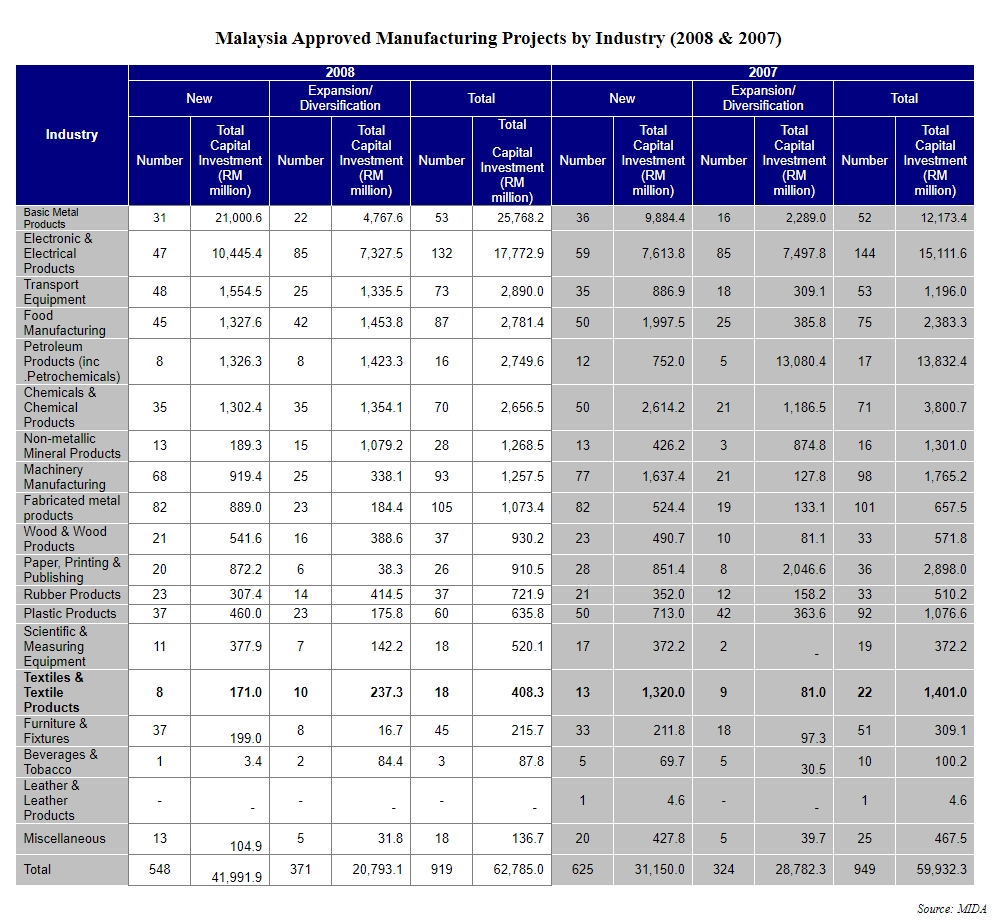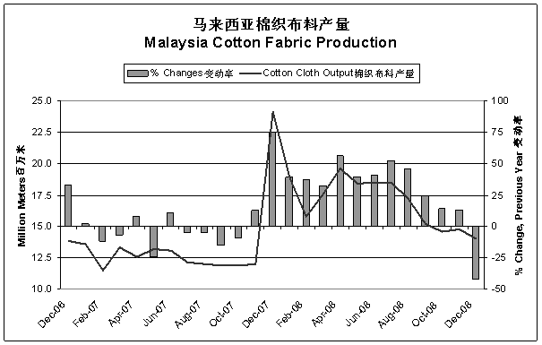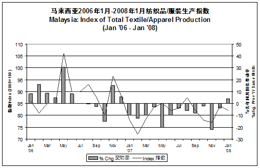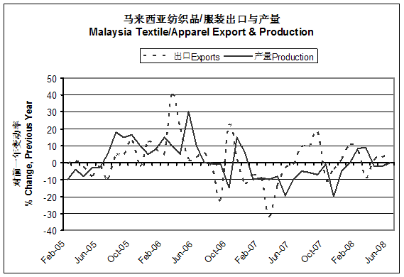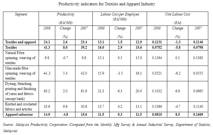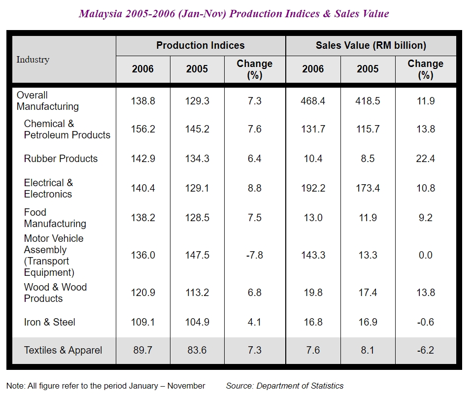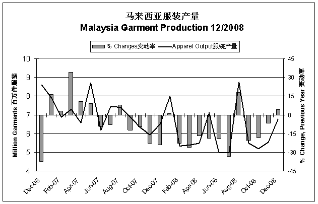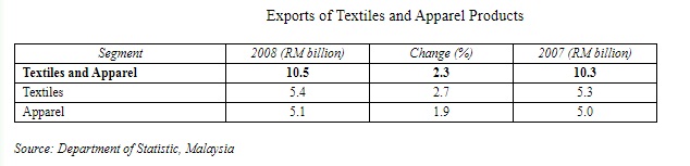 The performance of the textiles and apparel industry in Malaysia was affected by global economic crisis. The overall decline in productions, sales and exports were mainly due to the decrease in consumption in major export destinations such the USA, EU and Japan. The industry is expected to recover in 2010 in line with the overall increases in the confidence of retailer to replenish their stock in anticipation of increased consumption due to the economic recovery.