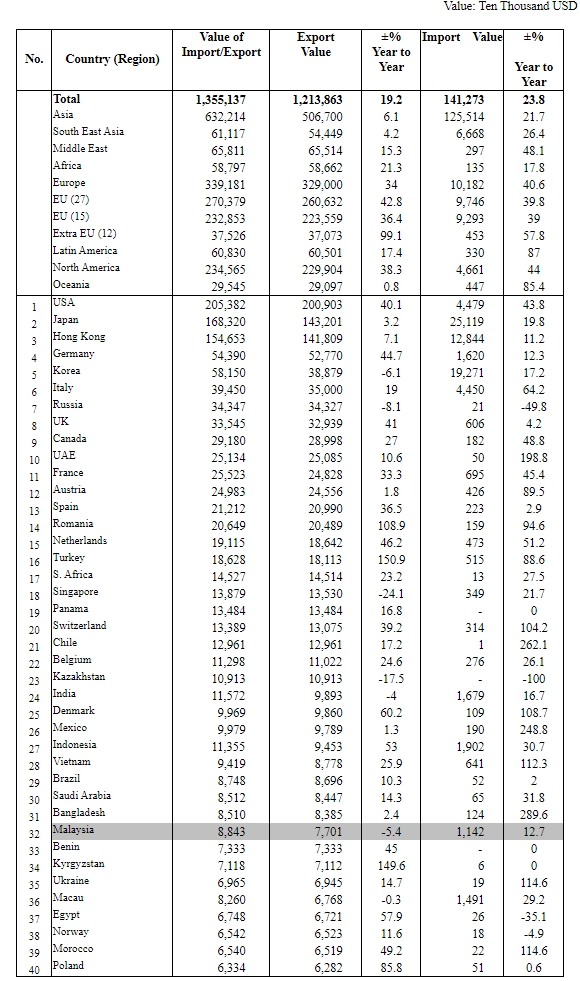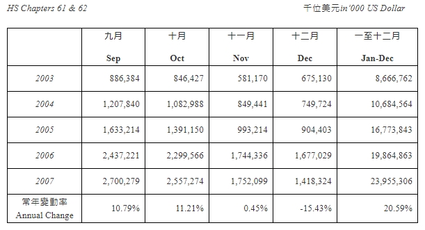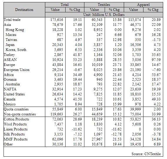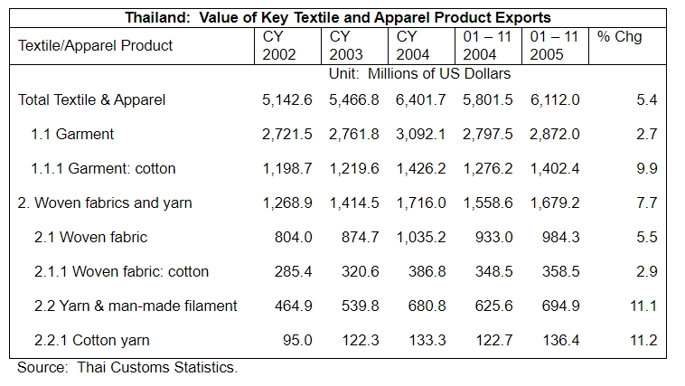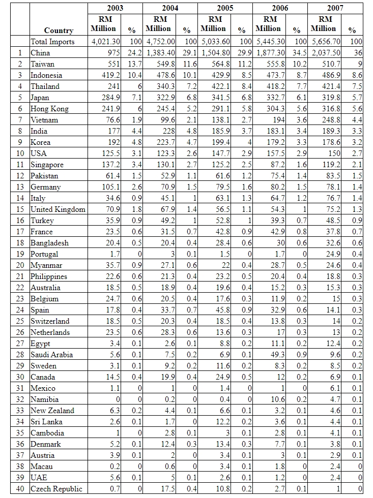 Major sources of imports for textiles and apparel products were China of RM1.6 billion or 35.6% of total imports. Taiwan was next with RM427.8 million followed by Thailand (RM378.3 million), Indonesia (RM314.3 million) and Japan (RM288.2 million).