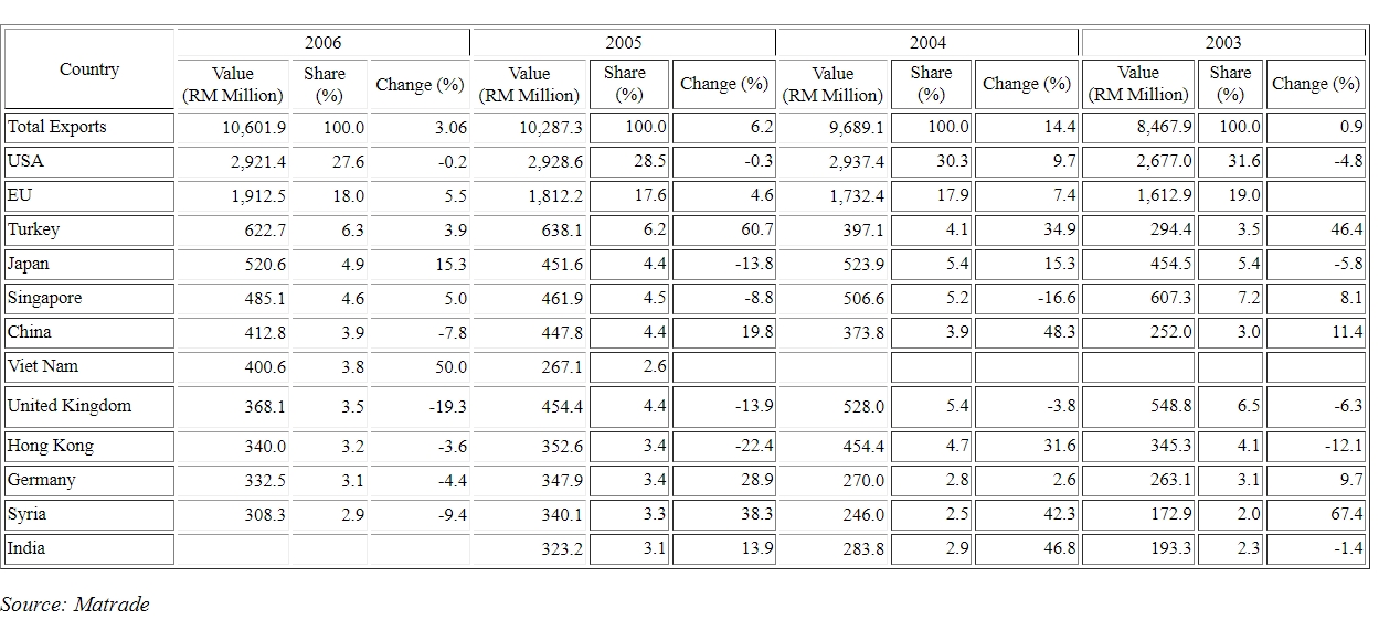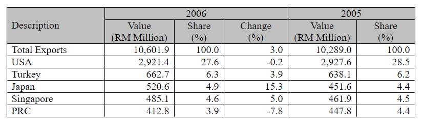 The USA was the largest export market for textiles and apparel in 2009, with exports amounting to RM1.8 billion and accounting for 20% of Malaysia’s total exports for textiles and apparel. The second largest market was Japan (RM720.1 million), followed by Singapore (RM486.4 million), Mexico (RM460.4 million) and China (RM408.4 million).