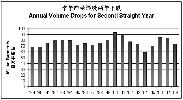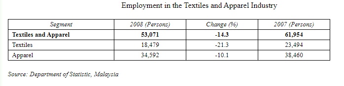 Employment in the textiles and apparel industry declined by 10.7% to 47,390 workers in 2009 from 53,071 workers in 2008 due to declining orders. Skilled workers nevertheless were retained to maintain the quality of products as many of the manufacturers were supplying OEM high-end products.