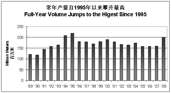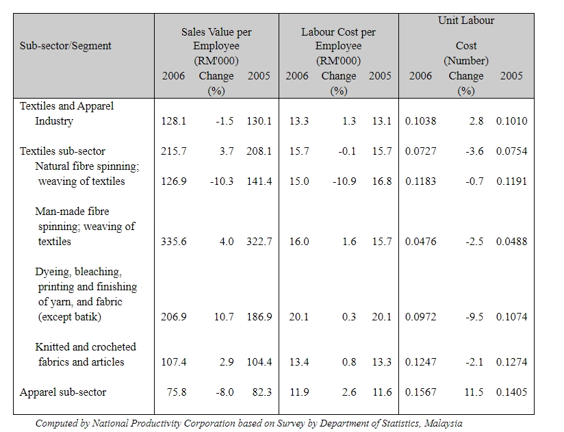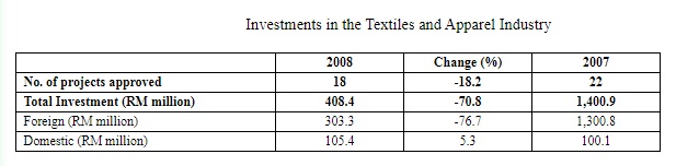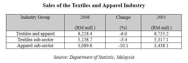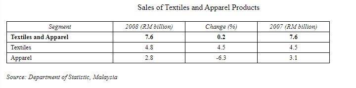 Sales of the textiles and apparel industry amounted RM7 billion in 2009, compared with RM7.6 billion in 2008. The reduction in overall sales was mainly due to decrease in orders and cancellations during second half of 2008 to early of 2009.