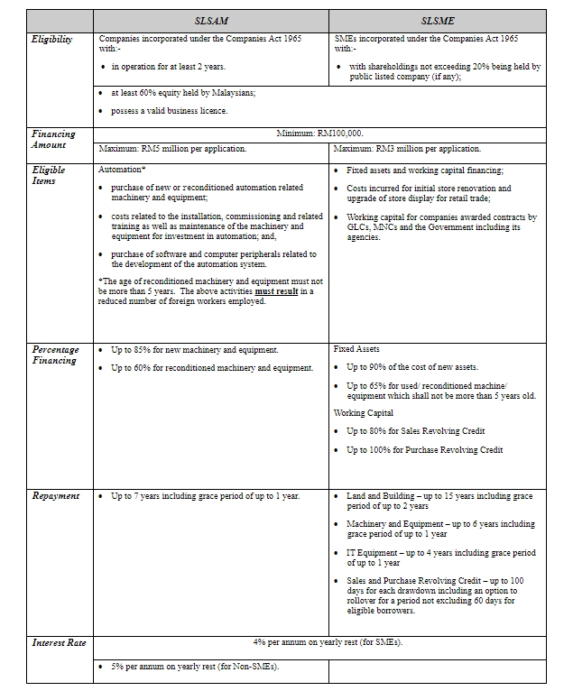 Financing granted under these Soft Loan Schemes are charged competitive interest rates of 4% per annum for SMEs whilst 5% per annum for Non-SMEs.