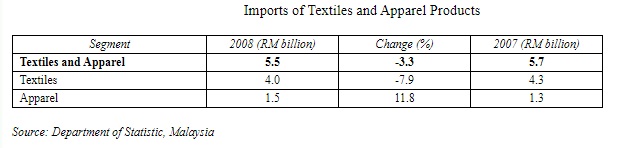Imports of textiles and apparel decreased by 18.3% to RM4.5 billion in 2009 from RM5.5 billion in 2008. The reduction was due to the decline in consumption, especially for expensive foreign items.